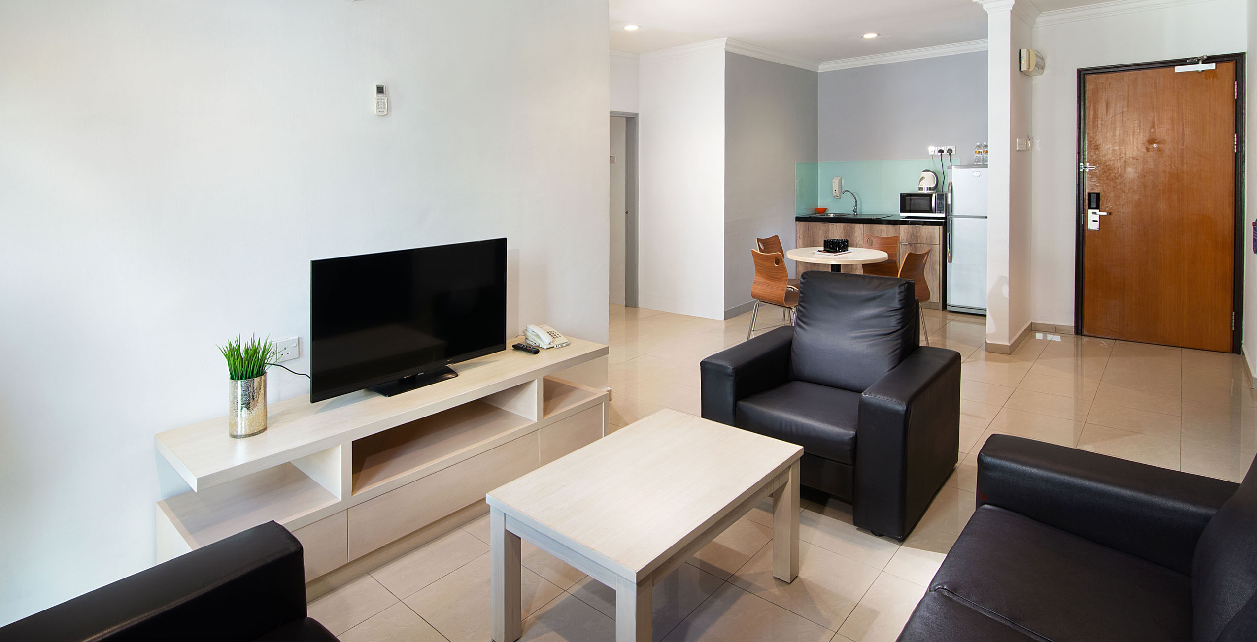 - Unit apartemen yang luas dengan ruang tamu, dapur kecil, 2 kamar tidur dan 2 kamar mandi